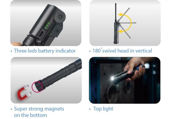 Materiał: PA + guma + obudowa aluminiowa. Głowica obrotowa 180 ° w pionie. Mocna podstawa magnetyczna. Akumulator: litowo-jonowy 3,7 V - 2600 mAh. Akcesoria: kabel ładujący USB typu C i ładowarka USB 5 V 1A. Ledowy wskaźnik baterii. Czas ładowania: 4 godz.