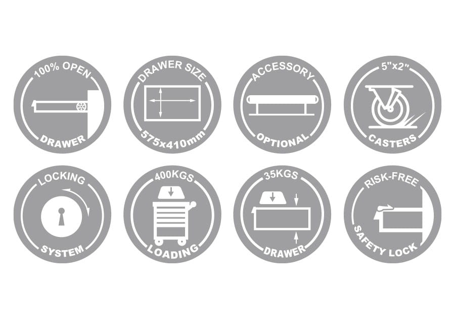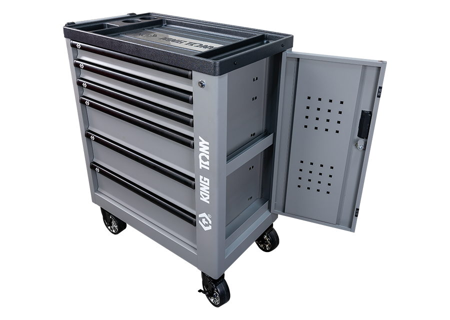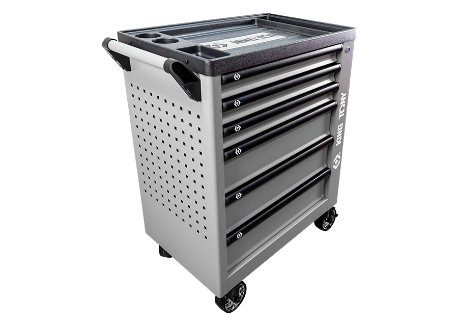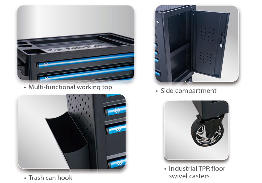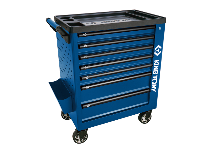 Wózek narzędziowy King Tony z 7 szufladami na łożyskach kulkowych i szafką boczną oraz wielofunkcyjnym blatem. Wózek posiada 5 szuflad o wysokości 70 mm i 2 o wysokości 140 mm - wszystkie o wymiarach 575x410 mm, każda o ładowności 35 kg. Łączna ładowność statyczna wózka wynosi 400 kg. Wymiary wózka wynoszą 752 x 450 x 982 mm (szerokość x głębokość x wysokość z kółkami 5”x2"). Waga wózka wynosi 58 kg.