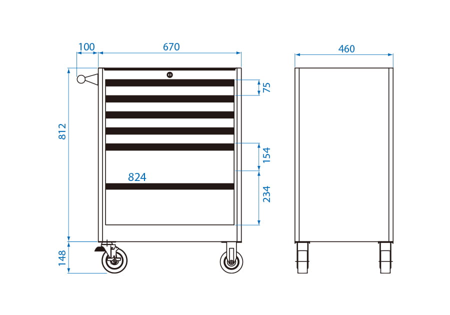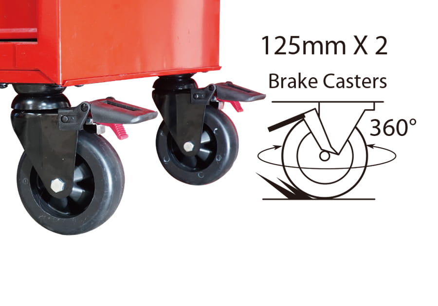 Wózek narzędziowy King Tony z 8 szufladami na łożyskach kulkowych. Wytrzymały wózek o wadze 64 kg i całkowitej nośności statycznej do 1000 kg w konstrukcji obudowy wykonanej z jednego elementu blachy o grubości 1 mm. Wózek warsztatowy posiada 7 szuflad o wymiarach 576x380x75 mm o nośności 40 kg i jedną szufladę o wymiarach 576x380x154 mm o nośności 50 kg. Szuflady z pełnym wysuwem. Wymiary wózka to 680x460x960 mm (szerokość x głębokość x wysokość - z kołkami i rączką). Cztery koła 5"x2" w tym dwa skrętne z hamulcem.