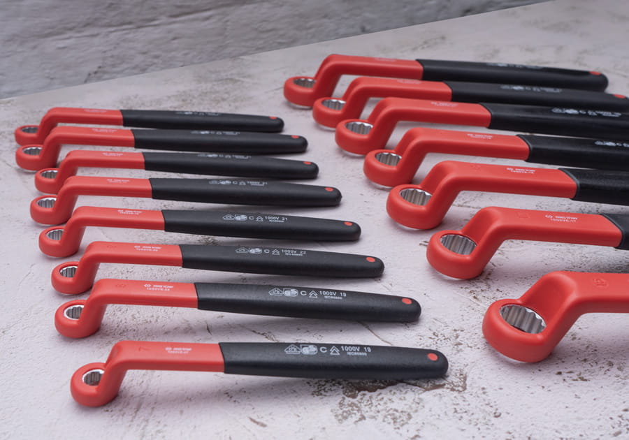 Zestaw kluczy oczkowych odgiętych 75° izolowanych VDE King Tony spełniających normę IEC 60900:2012 we wkładzie o wymiarach 375 x 280 mm z pianki EVA do szafki narzędziowej. Zestaw narzędzi zawiera 15 kluczy w rozmiarach 7-19, 21, 22, 24 mm.