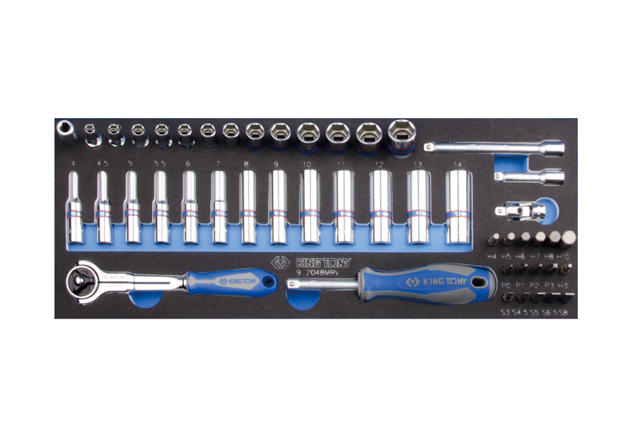 ZESTAW NASADEK 1/4" 48cz. KRÓTKIE / DŁUGIE, 6-kąt. 4 - 14mm Z AKCESORIAMI, CHROM, WKŁAD Z PIANKI, DO WÓZKA King Tony 9-2548MRV