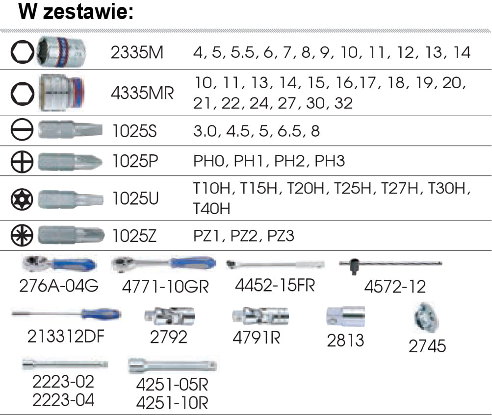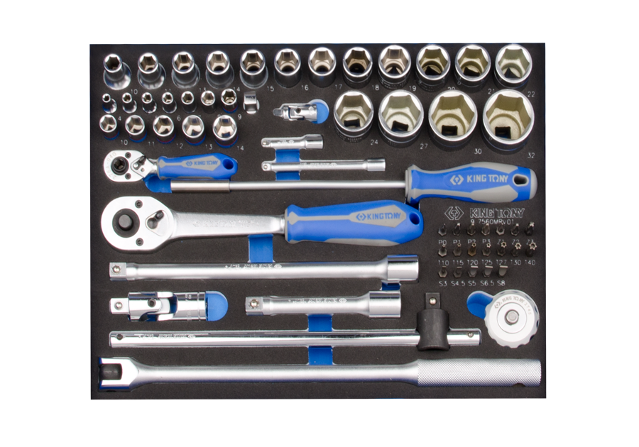 ZESTAW NASADEK 1/4" ORAZ 1/2" 60cz. KRÓTKIE 6-kąt. 4 - 32mm Z AKCESORIAMI, CHROM, WKŁAD Z PIANKI, DO WÓZKA King Tony 9-7560MRV01
